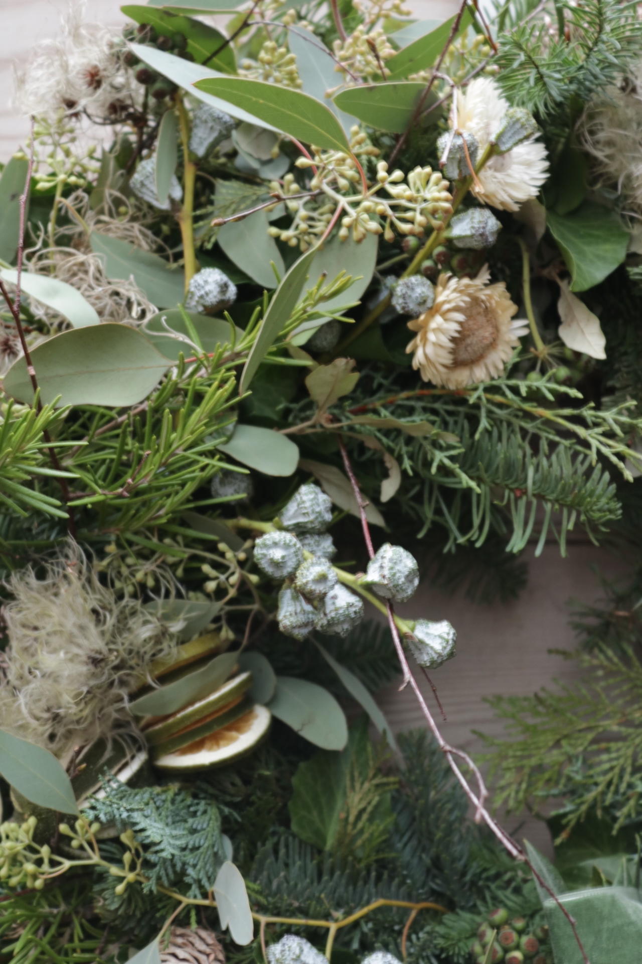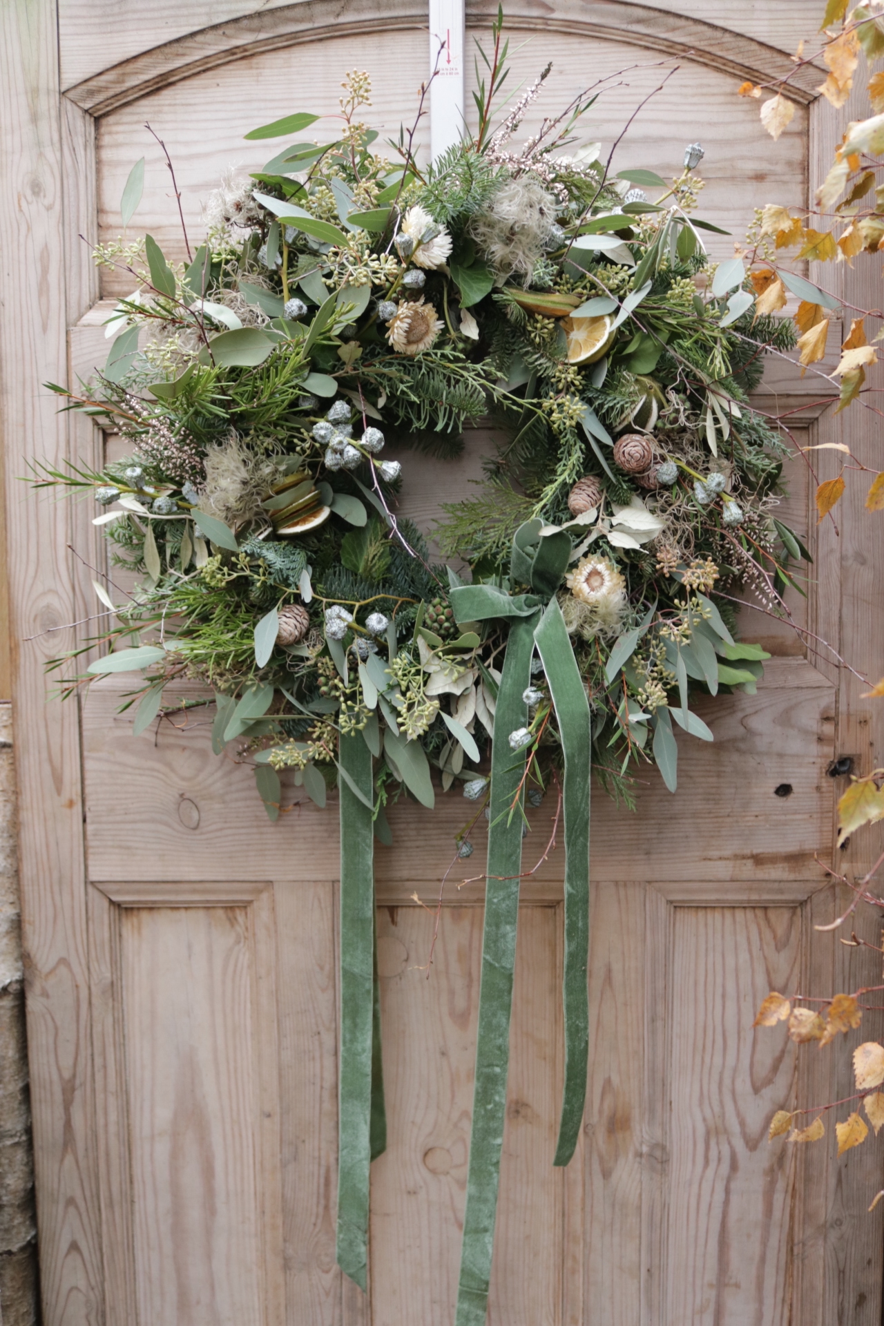 A beautifully fresh and fragrant frosty Christmas wreath, handcrafted with scented pine and winter foliage. Its natural textures are adorned with delicate accents of white and silvery-grey honesty, soft Spanish moss, rustic cones, eucalyptus pods, and dried limes, all interwoven with dainty wax flower and dried elements. The look is ethereal and understated, striking a perfect balance of elegance and simplicity. Finished with a luxurious grey velvet ribbon, this wreath brings a touch of timeless, stylish charm to the season.