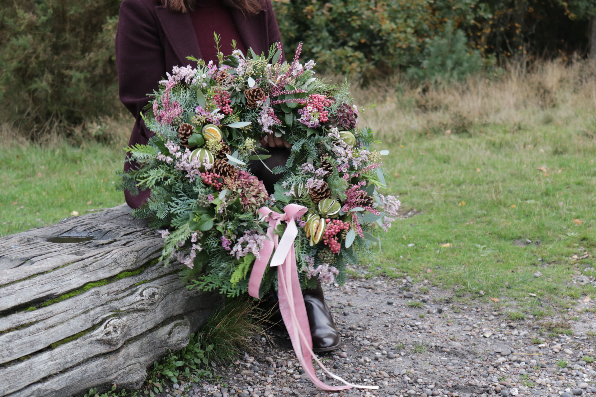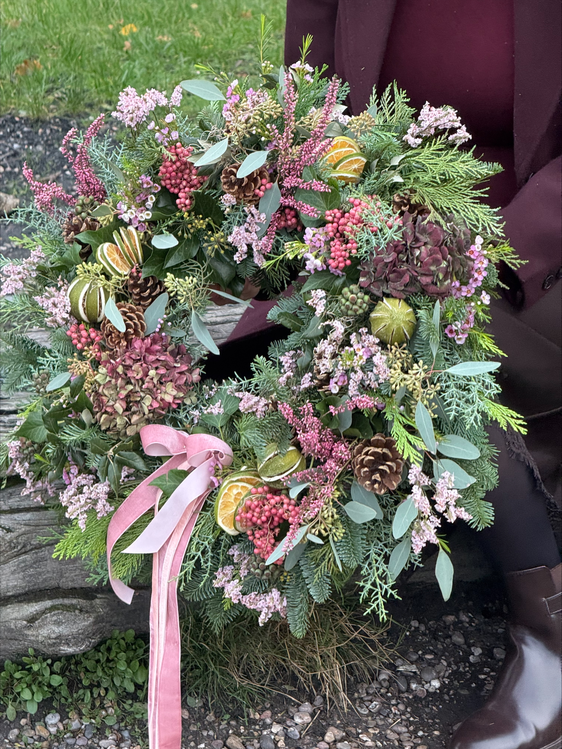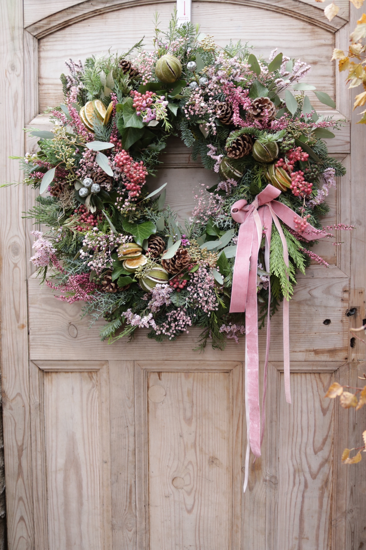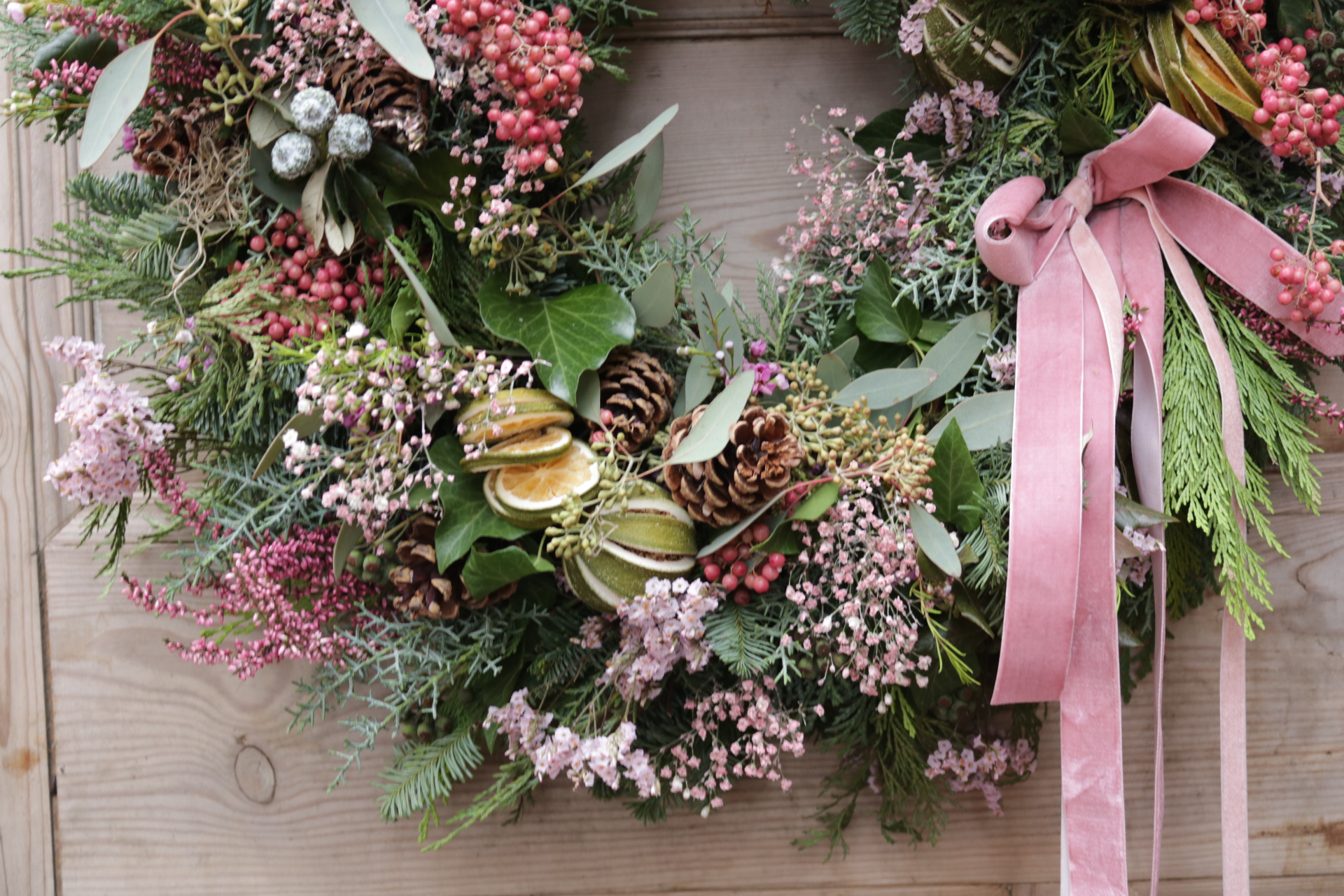 A wild and whimsical Christmas wreath where foliage and texture take centre stage. Built on a base of fresh, scented evergreens, it’s brimming with a natural mix of luscious foliage, airy dried grasses, and delicate trails of Spanish moss. Subtle accents of pale pink wax flower and lilac limonium bring a soft, romantic touch, while clusters of peachy-pink berries add gentle warmth. Finished with a soft pink velvet ribbon, this design feels untamed yet graceful—effortlessly stylish with a free-spirited charm.